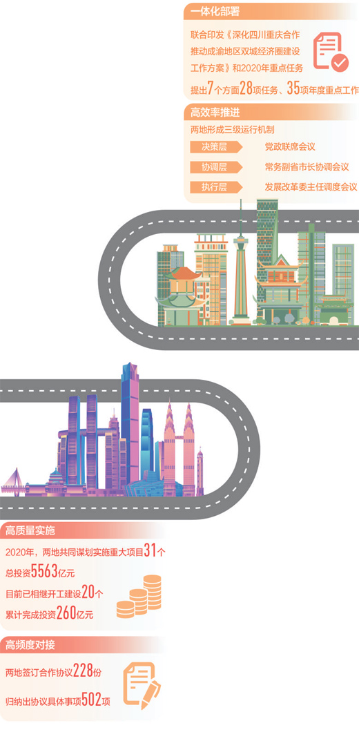 2020年,是雙城攜手共進、大手筆接連不斷的一年:牽手31個重大項目,總投資5563億元;能源一體化正加速,20個重大項目總投資約9900億元;雙城攜手多地共同推進西部陸海新通道建設,共建省際協商合作聯席會議制度;兩省市有關部門、市區(縣)簽署各類協議228份,多數事項進展良好……