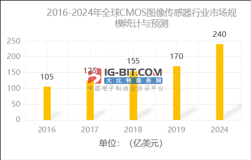 CMOS圖像傳感器是一種典型性的固態顯像傳感器,一般由像敏模塊列陣、行控制器、列控制器、AD轉換器、系統總線輸出插口、操縱插口等幾部分構成,這幾部分一般都被集成化在同一塊單晶硅片上。從圖上的數據信息得知,2018年全球CMOS圖像傳感器行業市場規模做到155億美金;上年全球CMOS圖像傳感器行業市場規模做到170億美金,增長速度是9.7%;預估2024年全球CIS市場規模將做到240億美金,除開手機外,轎車智能化系統的必要性也持續升高。