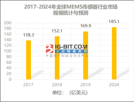 MEMS傳感器是根據微機電系統的典型性傳感器件。它就是指能夠大批量生產制造的,集薄膜光學、微傳感器、微電動執行機構及其信號分析和控制回路于一體的元器件或系統軟件。從圖5中得知,2017年全球MEMS傳感器的市場規模是138.3億美金;上年的全球MEMS傳感器行業市場規模早已做到169.9億美金。近年來,憑借MEMS傳感器的優點,全球MEMS傳感器發展趨勢速率加速,因而預測分析到2024年全球的MEMS傳感器行業市場規模有希望做到185.1億美元。