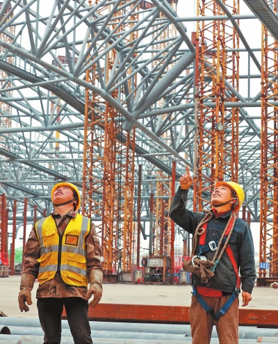 鄭州南站站房工程進行吊裝提升施工現場。記者 聶冬晗 攝