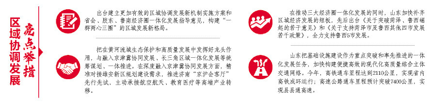 山東把區(qū)域協(xié)調發(fā)展作為八大發(fā)展戰(zhàn)略之一,建立更加有效的區(qū)域協(xié)調發(fā)展新機制,構建了“一群兩心三圈”的區(qū)域發(fā)展新格局。當下,山東三大經濟圈一體化發(fā)展勢頭良好,同時積極對接國家重大區(qū)域發(fā)展戰(zhàn)略,主動融入新發(fā)展格局,優(yōu)勢互補、高質量發(fā)展的區(qū)域經濟布局加快形成。