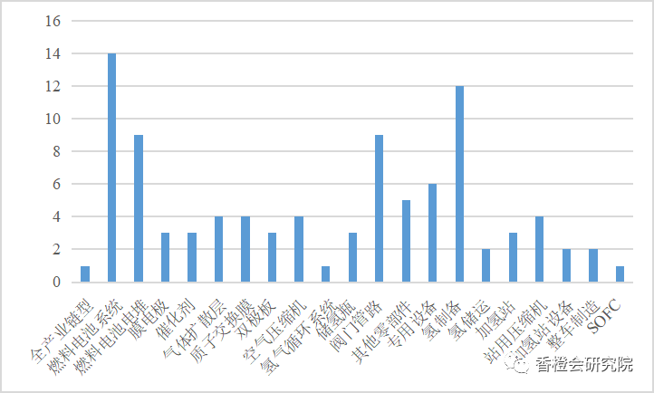 其中排在前三位的分別是燃料電池系統(14家)、氫制備(12家)、燃料電池電堆(9家)、閥門管路(9家),這與當前國內氫能和燃料電池汽車產業發展現狀比較契合。
