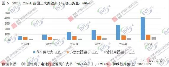 在汽車用動力電池領域,隨著新能源汽車滲透率逐步提升,預計到2025年,我國動力電池出貨量可達422.28GWh;在小型類鋰離子電池領域,可穿戴設備、無人機、小動力等新興消費領域將帶動小型類鋰離子電池出貨量增長,預計到2025年,我國小型類鋰離子電池出貨量為96.0GWh;在儲能用鋰離子電池領域,隨著電力體制改革推進、儲能成本降低以及鋰電替代鉛酸進程加速,預計到2025年,我國儲能電池出貨量可達60.0GWh。