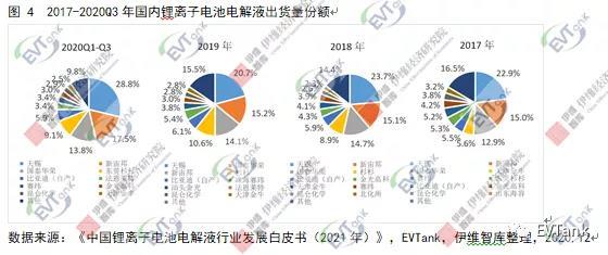 電解液的核心壁壘是保供能力,頭部企業憑借規模、成本、研發能力等優勢,市場份額持續增長,行業集中度進一步提升,2017年-2020Q3前四名企業合計市占率分別為56.4%、62.4%、60.6%和69.1%。2020Q3前十名企業合計市占率超過90%,龍頭企業不同產品分配較均衡,市場格局基本穩定,其中天賜材料憑借其產業鏈布局完善、成本控制能力強、定制化能力突出及客戶壁壘較高等優勢,龍頭地位穩固;新宙邦、國泰華容、杉杉等第一梯隊企業增量明顯;比亞迪、法恩萊特、珠海賽緯和金光高科等第二梯隊企業市場份額也在逐步提升。具體來看,天賜材料穩居第一,市場份額達到 28.8%;新宙邦排名第二,市場份額為 17.5%;國泰華榮排名第三,市場份額為 13.8%;東莞杉杉排名第四,市場份額為9.1%。