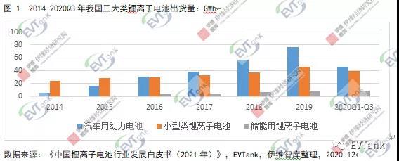 按應用領域分類,鋰離子電池主要分為汽車用動力電池(EV Lib)、小型類鋰離子電池(Small Lib)和儲能用鋰離子電池(ESS Lib)三大類,其中,汽車用動力電池出貨量主要受新能源汽車銷量的影響,近年來各國對環保的重視驅動新能源汽車滲透率逐步提高,雖然上半年受疫情影響,汽車用動力電池出貨量同比下滑45.8%,但是下半年新能源汽車產銷量的單月同比大幅增長,截止到2020年11月,我國汽車用動力電池累計出貨量62.5Gwh,累計同比下降幅度已經收窄到7.0%。小型類鋰離子電池主要用于手機、電腦、電動工具、電動二輪車及新興消費應用等領域,2020Q1-Q3,在5G手機、電動工具和電動兩輪車用電池的帶動下,我國小型類鋰離子電池出貨量達到39.7Gwh,同比增長16.5%;儲能用鋰離子電池仍處于市場導入階段,出貨量較少,但增長速度較快,在基站建設、海外儲能和國內發電側儲能項目的帶動下,2020Q1-Q3我國儲能電池出貨量為9.1GWh,已經超過去年全年水平。