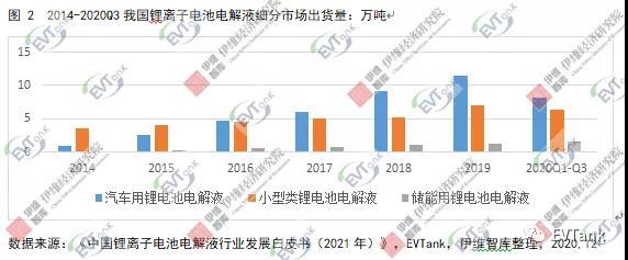 電解液屬于鋰電四大材料之一,是鋰離子電池的血液,在保障鋰離子電池的安全性、長循環等性能方面至關重要。目前,電解液已基本實現國產化,其出貨量與鋰離子電池出貨量成正比。2020年初受疫情影響,鋰電池需求低迷、開工率低,隨著二季度國內疫情控制后有序復工復產,國內經濟復蘇超預期,鋰電池需求增長帶動電解液出貨量回升,截止2020Q3,我國鋰離子電池電解液出貨量為16.1萬噸,近六年年均增長速度為34.5%,其中,汽車用動力電池電解液出貨量為8.2萬噸,小型類鋰離子電池電解液出貨量為6.3萬噸,儲能用鋰離子電池電解液出貨量為1.6萬噸。