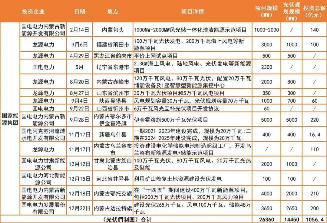 在這一大目標之下,光伏們獨家獲悉,“十四五”期間,國家能源集團光伏計劃新增50GW,其中2021年光伏目標裝機為10GW,項目收購與自主開發(fā)同步推進。在2020年9月份的一場論壇上,國家能源集團董事長王祥喜曾表示,清潔能源規(guī)模化的具體措施包括擴大可再生能源投資,提高清潔能源比重,推進風光火儲一體化,規(guī)劃建設千萬千瓦級綜合能源基地等。
