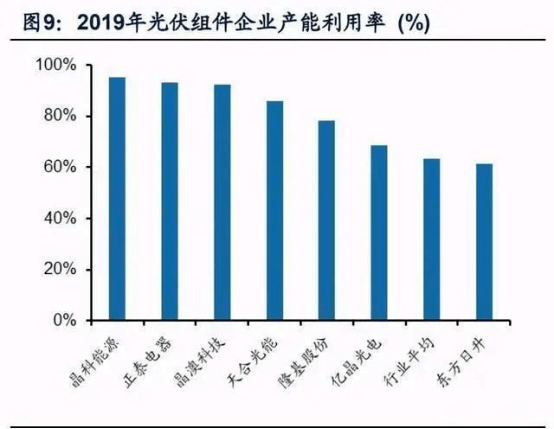 由于組件環節具有較高的資產周轉率和投入資本回報率,吸引大量產業資本進入,基于對全球光伏新增裝機未來前景的判斷,組件產能總是超配實際裝機需求, 導致組件環節產能長期過剩。根據光伏行業協會,2019年全球組件產能218.7GW, 產量138GW,產能利用率63.2%。企業產能利用率分化明顯,其中晶科能源、正泰 電器、晶澳科技、天合光能、隆基股份組件業務產能利用率分別達到95.3%、93.2%、 92.5%、85.9%、78.4%,顯著高于行業平均產能利用率。
