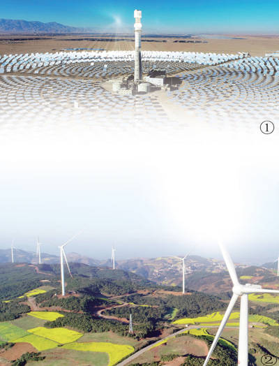 圖①:青海省海西蒙古族藏族自治州的光熱電站。 本報記者 賈豐豐攝 圖②:云南省曲靖市羅平風電一期工程。 毛 虹攝(影像中國)