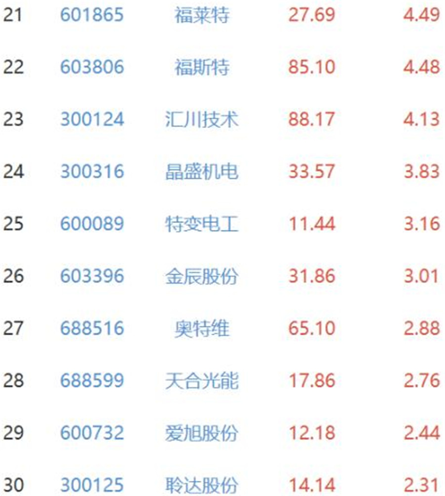30日全天,數(shù)百只光伏概念股中,不少個(gè)股出現(xiàn)了大漲行情,其中錦浪科技、固德威、中信博、陽(yáng)光電源、隆基股份、新特能源、上能電氣、通威股份、東方日升全線暴漲。這些概念股的總成交額為800億元,也打破了多日以來(lái)股市的寂靜。