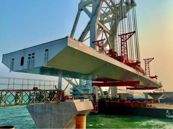 “我們進(jìn)行了多次安全檢驗(yàn)和模擬演練,裝船全程監(jiān)測(cè)12個(gè)船艙,及時(shí)調(diào)整壓載水系統(tǒng),克服了潮漲潮落的影響,確保裝載和航行安全。”深中通道G03合同段技術(shù)部長(zhǎng)黃利航解釋。運(yùn)輸船將鋼箱梁運(yùn)抵智慧梁場(chǎng)出海平臺(tái)后,再由運(yùn)架一體船“天一號(hào)”取梁并運(yùn)往指定橋位。