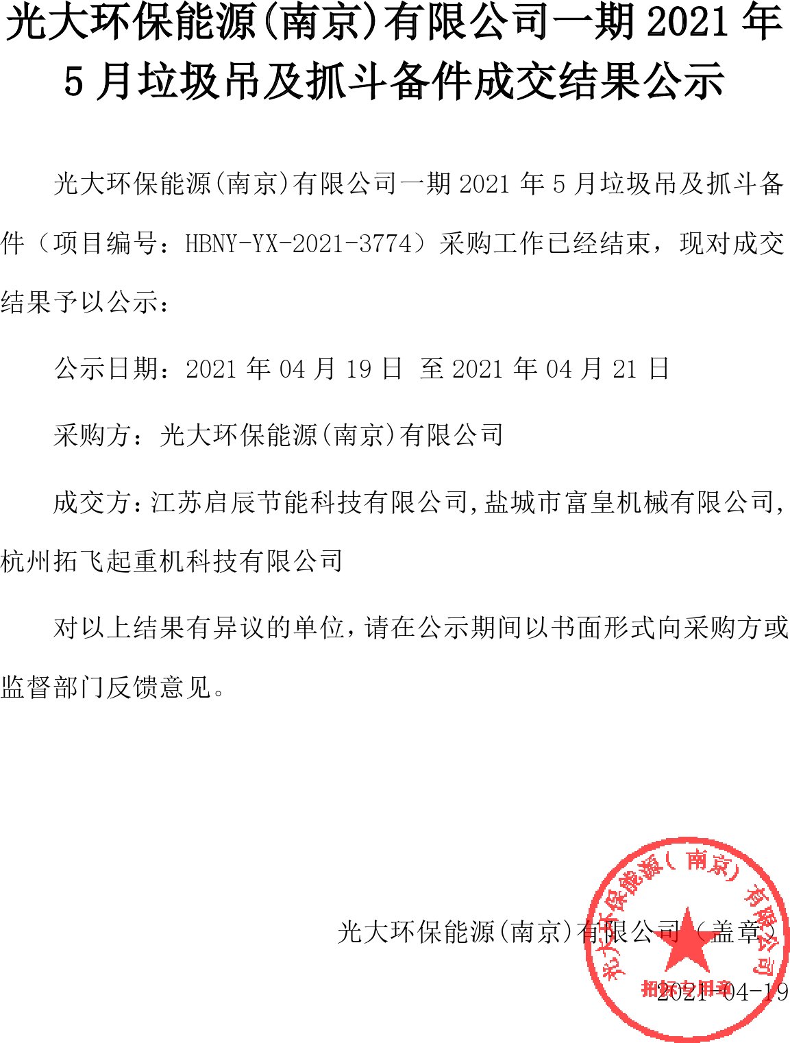 移動版:江蘇:一期2021年5月垃圾吊及抓斗備件成交結果公示