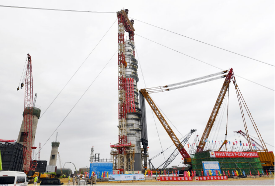 由CPECC第一建設公司主導研發的世界最大MYQ5000噸門式起重機擔任主吊、新購置的“世界第一吊”徐工XGC88000履帶起重機(目前國內唯一一款獲得歐盟CE認證的四千噸級履帶起重機)負責抬尾,采用液壓提升工藝,成功實現4000噸級超大型塔器整體吊裝,刷新亞洲最重塔器吊裝紀錄,完美展現中國裝備制造、中國吊裝技術實力。