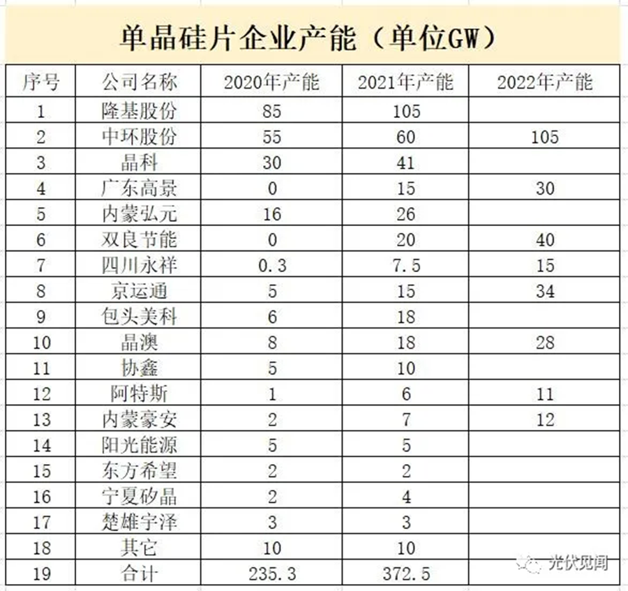 最近統計了國內單晶硅片產能,據不完全統計,2020年國內單晶硅片產能在235GW左右,2021年國內單晶硅片產能按照各公司規劃將增加到372.5GW左右。