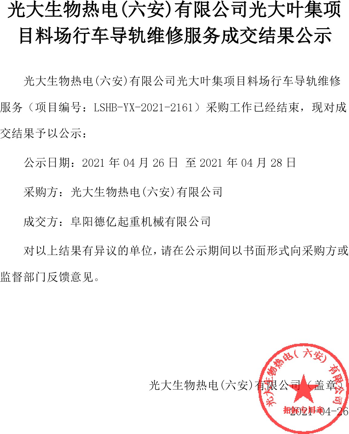 移動版:安徽:光大生物熱電(六安)有限公司光大葉集項目料場行車導軌維修服務成交結果公示
