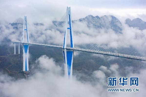 云霧繚繞中的平塘特大橋。新華社記者劉續攝