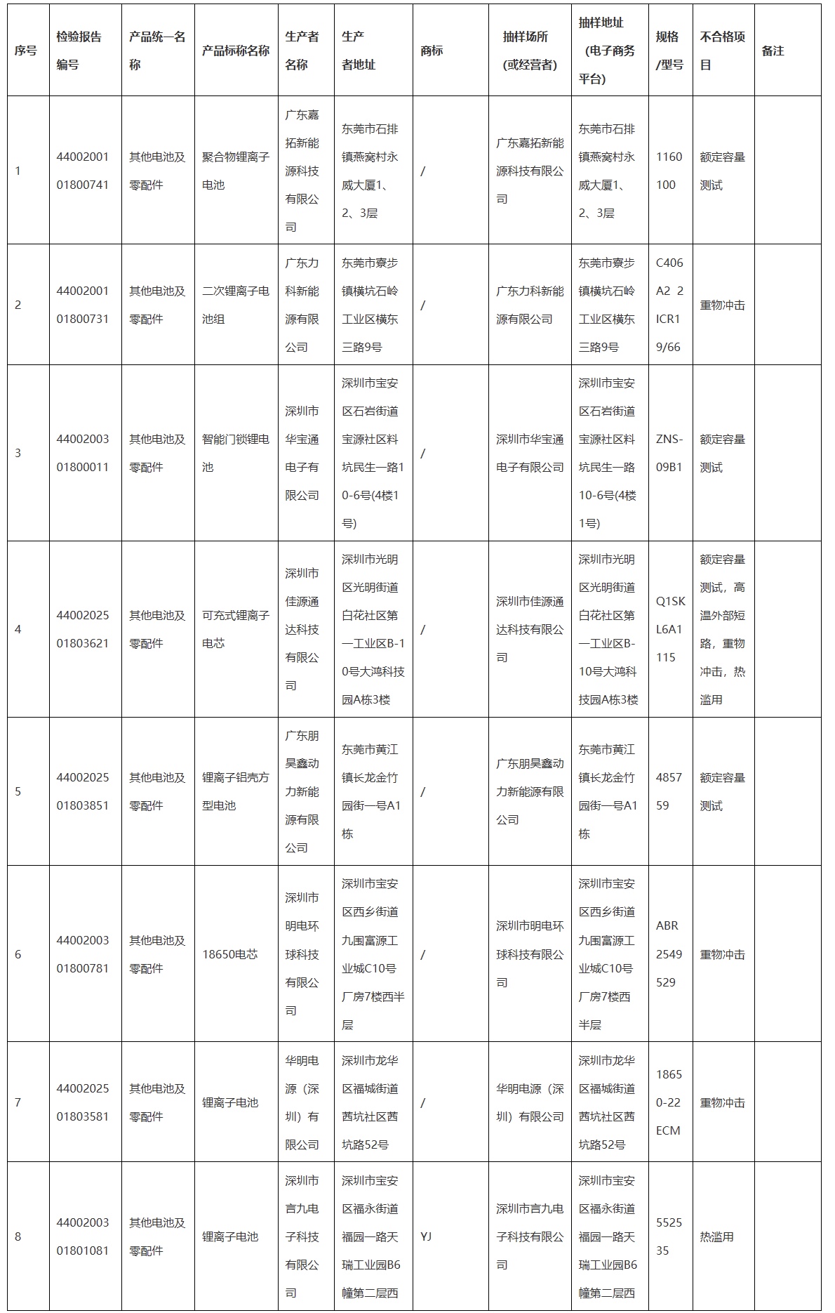 本次抽查重點對開路電壓、泄漏和變形、放電性能、運輸-沖擊、運輸-振動、不正確的安裝、外部短路、過放電、自由跌落、熱沖擊、強制放電、非正常充電、熱濫用、重物沖擊等43個項目進行了檢驗。經(jīng)檢驗,發(fā)現(xiàn)8家企業(yè)生產(chǎn)的8款產(chǎn)品不合格。不合格項目主要有:“額定容量測試”“重物沖擊”“高溫外部短路”“熱濫用”。不合格產(chǎn)品名單見附件。