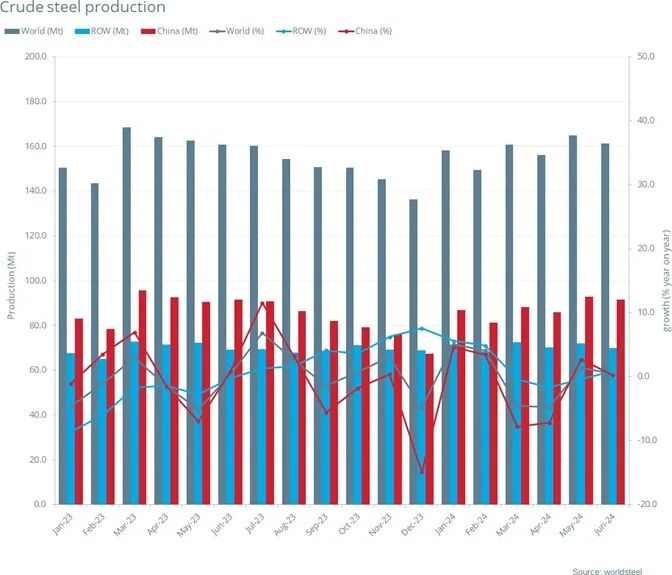 2024年6月全球71個納入國際鋼鐵協會計算國家的粗鋼產值為1.614億噸,同比進步0.5%。