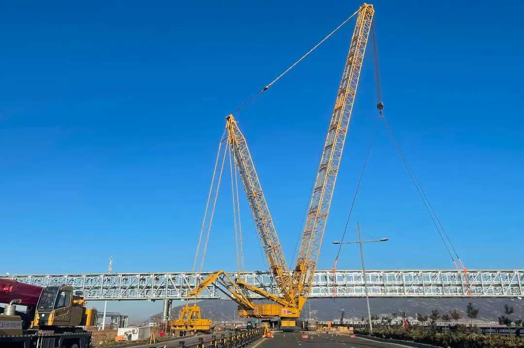 該項目包含五段鋼結構構件,其中CD段跨熱力管道需趴臂調整角度,EF段長90米約170噸重,對機械、人員協調配合有較大考驗。在吊裝開始前,項目部組織了多次專家評審,根據現場施工條件以及地基承載力驗算,最終確定采用1000噸履帶吊進行鋼結構吊裝作業,施工全過程可控、在控。