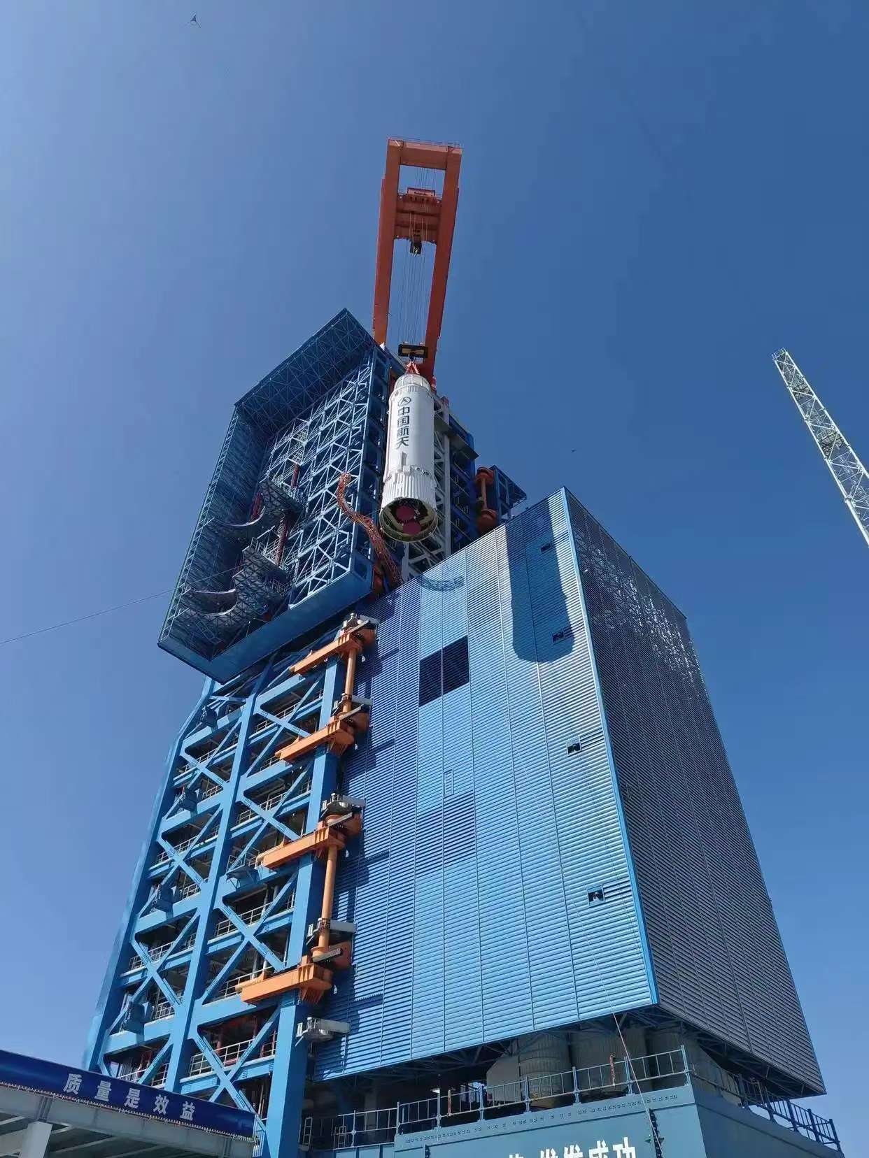 在發射區,1號發射工位固定勤務塔上大方火箭發射專用起重機對長征八號甲火箭進行吊裝,高精度配合其順利完成了分系統測試、總檢查測試、搶險演練及模擬加注發射等一系列流程。