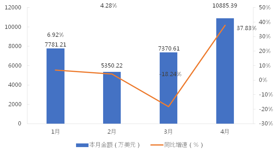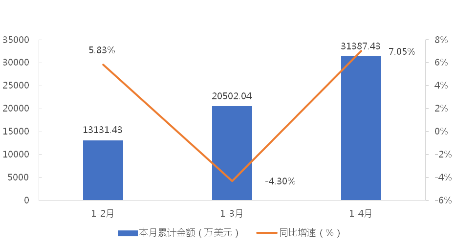 1-4月,我國履帶式起重機累計出口金額為31387.43萬美元,同比增長7.05%;累計出口數量為1372臺,同比下降79.87%;出口均價為22.88萬美元/臺,同比增長432.09%。