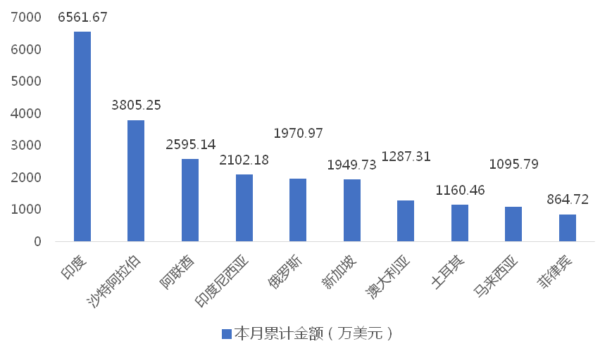 2025年4月,我國履帶式起重機出口金額排名前十位的國家/地區分別為沙特阿拉伯、阿聯酋、印度、印度尼西亞、俄羅斯、阿曼、幾內亞、土耳其、澳大利亞、肯尼亞,合計占我國該產品出口總額的79.40%。其中,向沙特阿拉伯出口最多,金額為1593.88萬美元,占出口總額的14.64%。